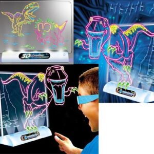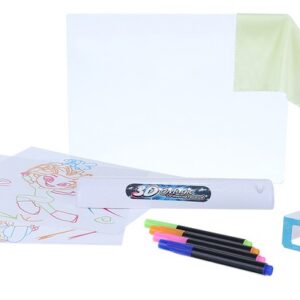 ✅ Pilns komplekts: plakana plastmasas plāksne, apgaismots statīvs, 4 krāsainas flomāsteras, 3D brilles.